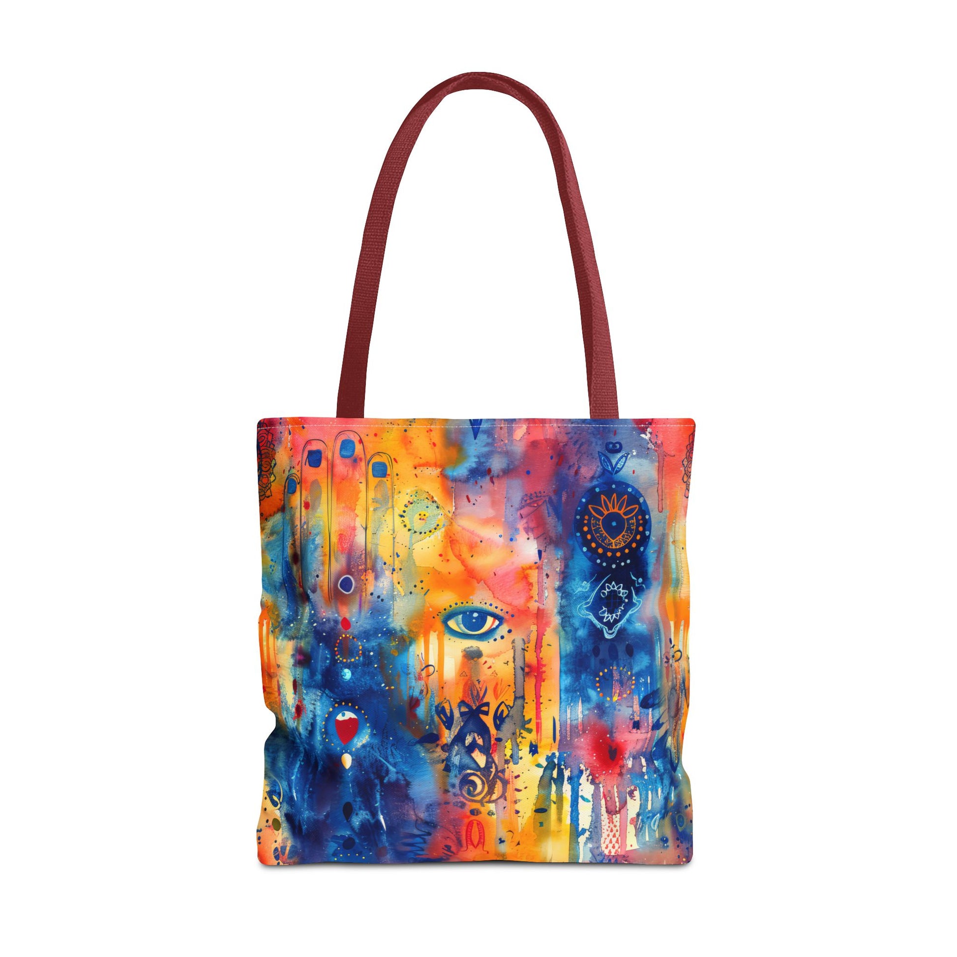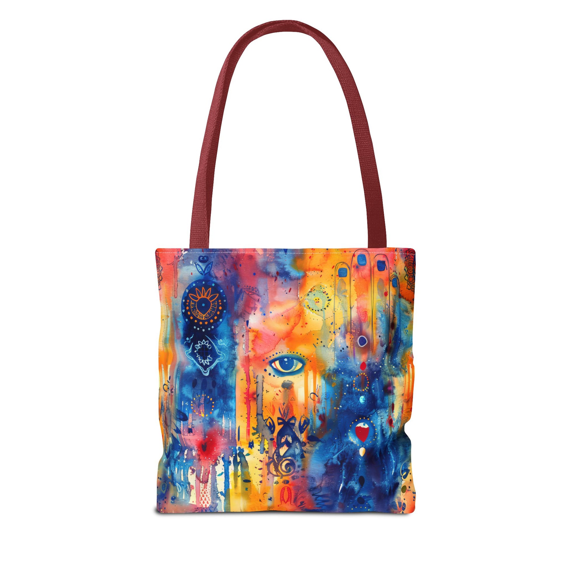 Carry good vibes wherever you go with our Rainbow Shield Tote Bag. Featuring ancient symbols like the evil eye and hamsa hand, this unique interpretation adds a colorful touch to your everyday use while providing protection. A must-have for any quirky and playful individual!